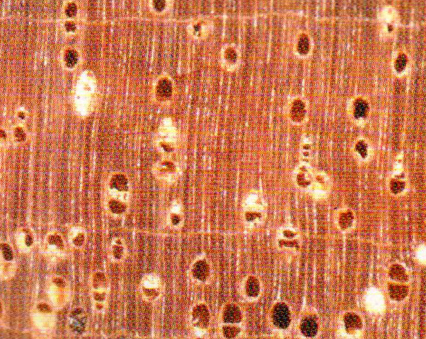 具金色光澤。紋理直至淺交錯(cuò);結(jié)構(gòu)細(xì)而勻;重量、強(qiáng)度中等;干縮大。加工容易,切面光滑;熱彎、油漆、染色、膠黏性能好;略難釘釘,握釘力中。略耐腐。干燥困難,易翹曲和皺縮。加工粉塵對(duì)黏膜有刺激。氣干密度0.60~ 0.74 g/cm3。
