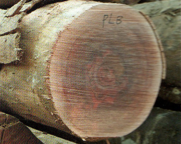 心邊材略明顯。心材暗紅褐色帶紫色調,心部具不規(guī)則花紋。邊材色稍淺,寬3~4cm。生長輪略明顯,輪間界以深色組織帶。