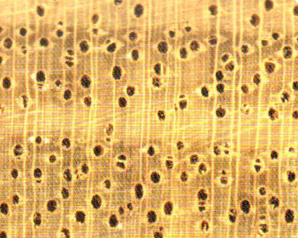 散孔材。管孔肉眼下可見略少,略大;主為單管孔,少數(shù)徑列復(fù)管孔(2~3個);具侵填體。軸向薄壁組織放大鏡下明顯,短翼狀及聚翼狀。木射線放大鏡下明顯。密度中,窄。